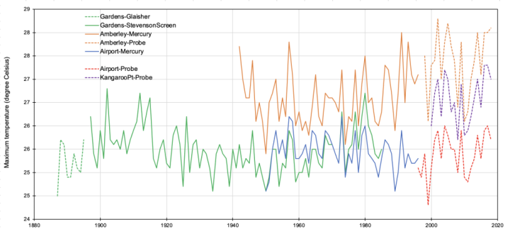 In the report entitled ‘The Australian Climate Observations Reference Network – Surface Air Temperature (ACORN-SAT) Version 2’ published in October 2018, Blair Trewin provides differences in what he refers to as diurnal range between manual and automatic instruments at six sites and concludes these are small. For example, at Mildura, Dr Trewin concludes there is a difference in the maximum temperature of just –0.22°C when considering the data for the period December 1997 to May 2000. What is not explained in this key report is that this is a statistically significant, and it is negative, indicating that the probes were underestimating the extent of warming.