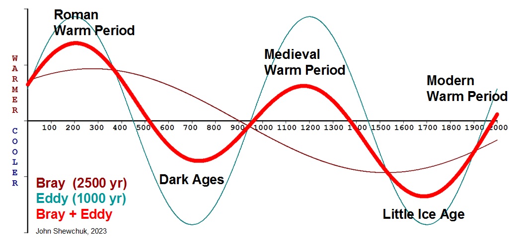 Regardless of amplitude settings, the Red line’s hi/lo peaks maintain proportional differences. The interesting part is how well the Bray and Eddy solar cycles correlate to the recent 2,000 years of climate change. We are still thawing out from the Little Ice Age.