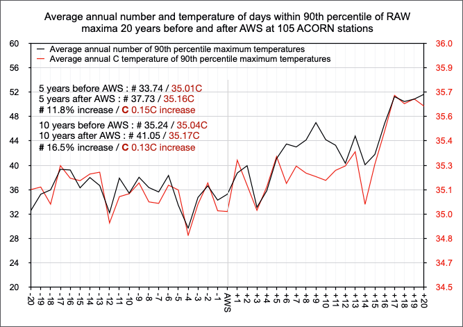 Examples include the ACORN station of Gunnedah where the annual frequency of 90th percentile days increased from 28.8 to 50.8 in the five years before and after 2001 AWS installation, with 90th percentile temperatures increasing from 35.4C to 36.3C.