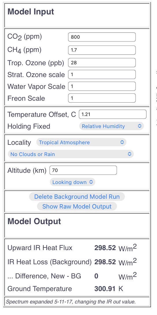 The second run started with clear sky, Tropical, 400 ppm CO2….then changed to 800ppm CO2. Again running surface temp offset until Q matched the base case at fixed relative humidity…Result is 1.21 C surface warming.