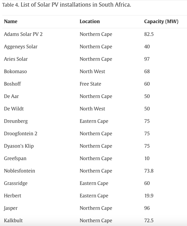 Nor has South Africa lagged in the march to solar energy. From the same piece in the Alexandria Engineering Journal, here is a list of solar projects (for some reason not including the years, but they are almost entirely post-2010):