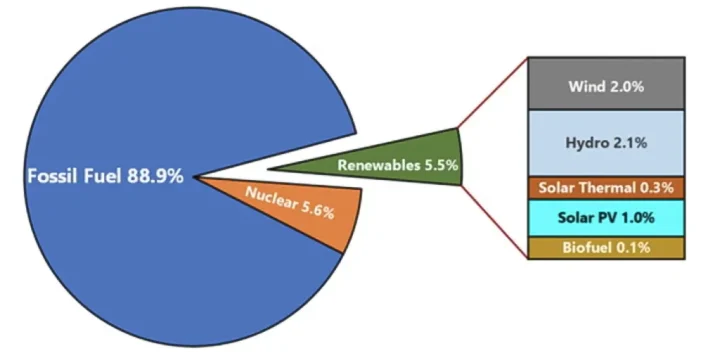 So surely by now the wind and sun must be providing the abundant and nearly-free electricity for all? Hardly. Here is a pie graph of the current electricity generation mix, stated to be based on data from the UN’s International Energy Agency: