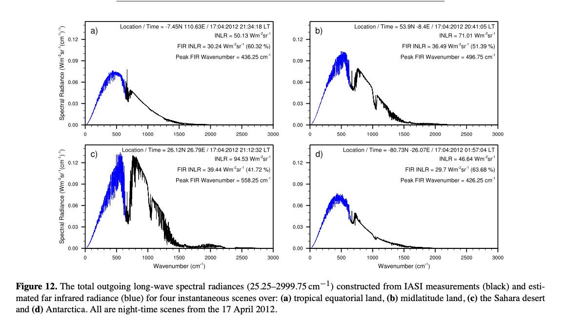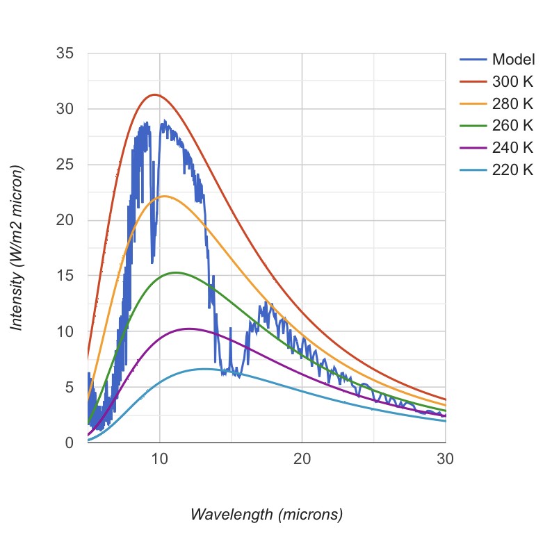 I have attached the spectra from the various scenes based on actual satellite measurement extracted from the paper I linked to above. You will note the peak radiance over Sahara is 558/cm or 17.9 micron. Way lower than your imaginary peak in your chart.