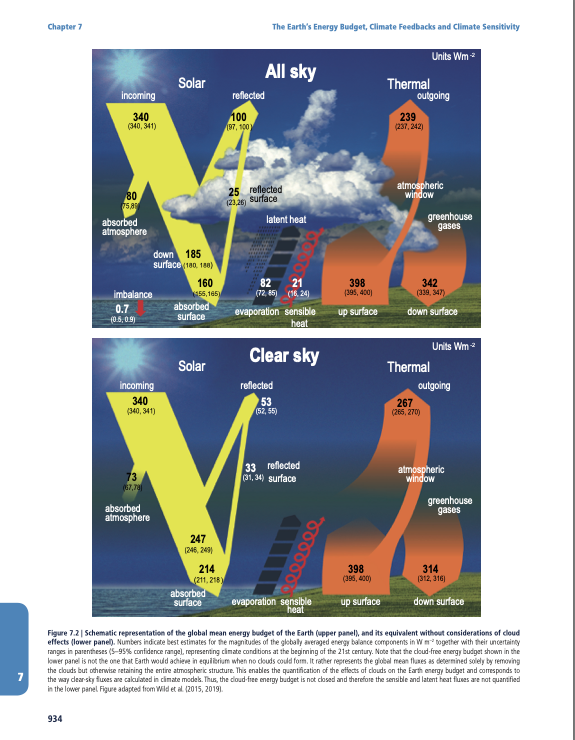 I would point out that the “clear sky” case in the graphic has the same 398 W/sq.M upwards IR, which means it uses the same surface temperature as the 65% cloudy “all sky” case.