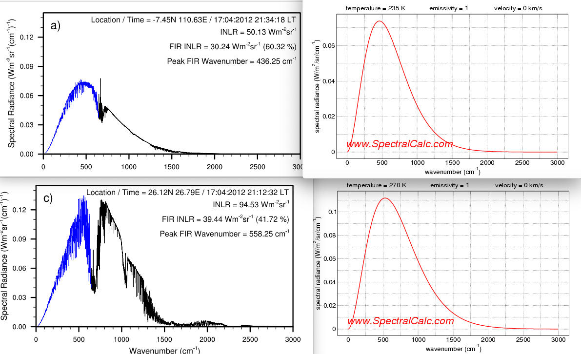 Tropical atmosphere has a long wave spectrum well correlated to a black body at 235K where surface is 303K. Clear sky over the Sahara correspond to a black body at 270K when the surface temperature is 298K – per attached. High resolution spectral curves from this paper: