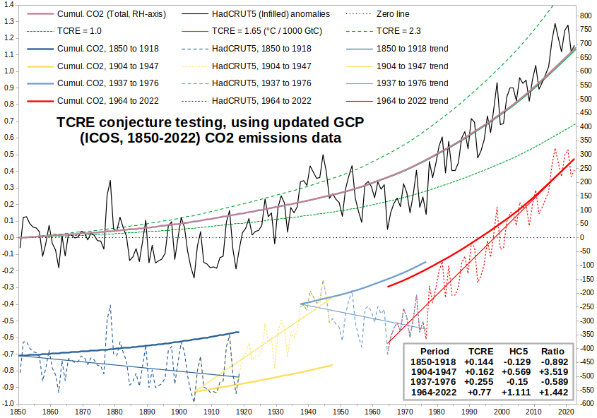 The discrepancies between the results derived from assuming “the TCRE concept” and the actual empirical data are much more obvious when using the “X-axis = Calendar year” viewpoint.