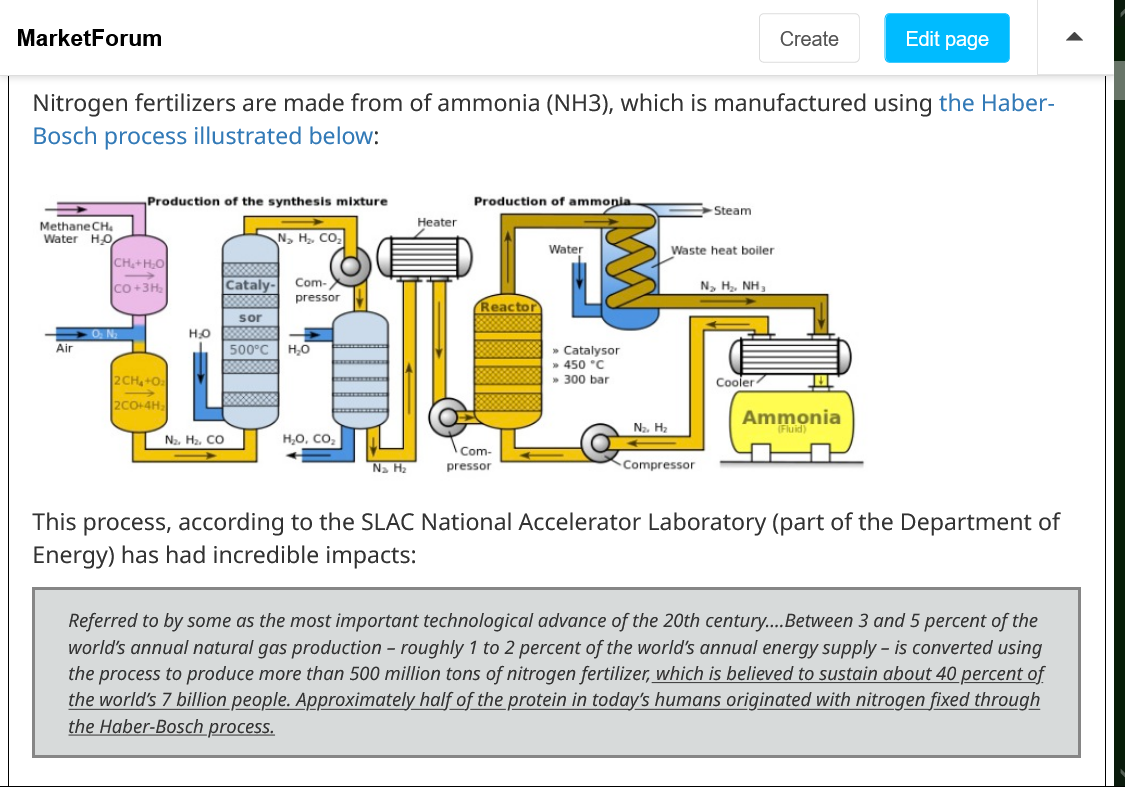“Referred to by some as the most important technological advance of the 20th century….Between 3 and 5 percent of the world’s annual natural gas production – roughly 1 to 2 percent of the world’s annual energy supply – is converted using the process to produce more than 500 million tons of nitrogen fertilizer, which is believed to sustain about 40 percent of the world’s 7 billion people. Approximately half of the protein in today’s humans originated with nitrogen fixed through the Haber-Bosch process”