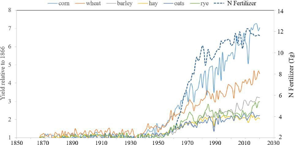 A brief history of U.S.corn yield growth since the 1860s Notable growth in yields was seen after the adoption of modern fertilizers in the 1940s, which made drought years esp. in the 1980s stand out more than before (compare with 1930s Dust Bowl for example).