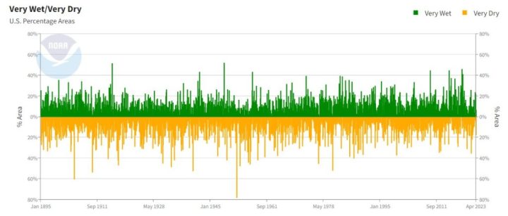 There is no upward or downward trend in this data. However, examining the data carefully shows that some of the biggest dry spikes are far in the past, such as in October 1952, when 78.42% of the contiguous United States was listed as very dry. This happened well before “human caused climate change” was ever even a subject, during a period when the Earth was in a cooling trend. No drought since has matched the one experienced in 1952, or multiple dry periods that occurred even earlier in the 1930s and early 1900s.