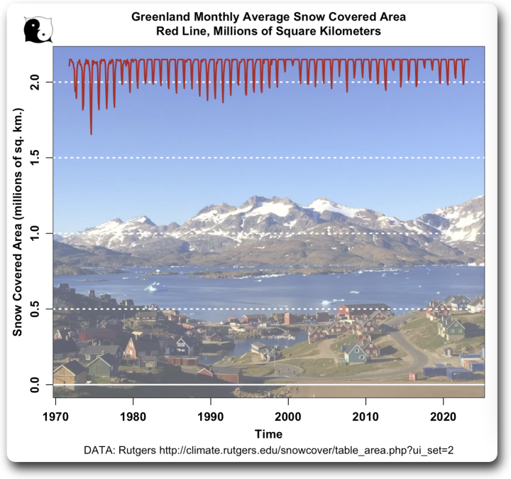 Here we can see that since 1972, by all measures and despite the general slight post-1972 global warming, the snow extent in Greenland has been steadily increasing. Not decreasing. Increasing.