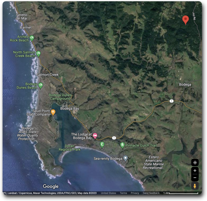 Here on our northern California hillside, we’re about six miles (10 km) from the ocean. Our house is at the location shown by the red pin in the forest at the upper right. We can see a tiny bit of the ocean between the far hills.