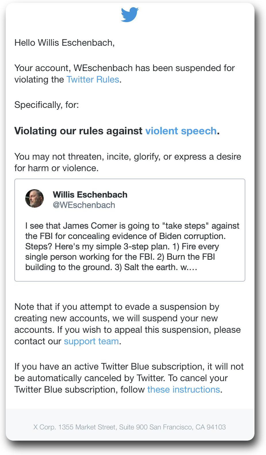 The bogus part is that lots of folks said almost exactly what I said, but are not suspended.
