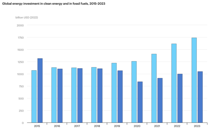 The recovery from the slump caused by the Covid-19 pandemic and the response to the global energy crisis have provided a significant boost to clean energy investment. Comparing our estimates for 2023 with the data for 2021, annual clean energy investment has risen much faster than investment in fossil fuels over this period (24% vs 15%). . . . We estimate that around USD 2.8 trillion will be invested in energy in 2023. More than USD 1.7 trillion is going to clean energy, including renewable power, nuclear, grids, storage, low-emission fuels, efficiency improvements and end-use renewables and electrification. The remainder, slightly over USD 1 trillion, is going to unabated fossil fuel supply and power. . . .