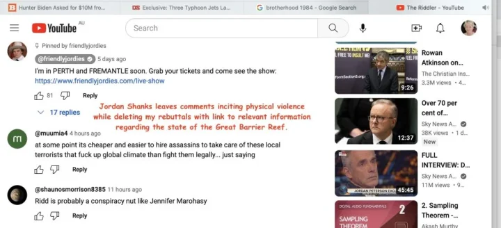 I can only conclude that Jordon Shanks diligently deletes relevant facts and information, while leaving comments that incite actual physical violence against Peter Ridd, because he really doesn’t care about the truth – not one bit. I can only conclude that Peter Ridd and the Great Barrier Reef are simply content, that he successfully uses to generate followers and income and thus power. This is also the history of the European royal families.