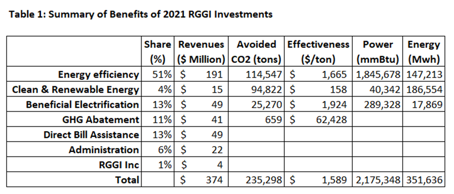 In 2021, $374 million in RGGI proceeds were invested in programs including energy efficiency, clean and renewable energy, beneficial electrification, greenhouse gas abatement, and direct bill assistance. Over their lifetime, these 2021 investments are projected to provide participating households and businesses with $1.2 billion in energy bill savings and avoid the emission of 4.4 million short tons of CO2.