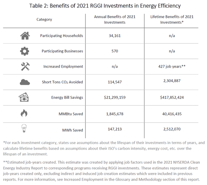 Energy efficiency remains the largest portion of 2021 RGGI investments, at 51%. Over the lifetime of the installed measures, 2021 RGGI investments in energy efficiency are projected to save participants over $417 million on energy bills, providing benefits to more than 34,000 participating households and 570 participating businesses. They are also projected to avoid the release of 2.3 million short tons of CO2 (see Table 2).