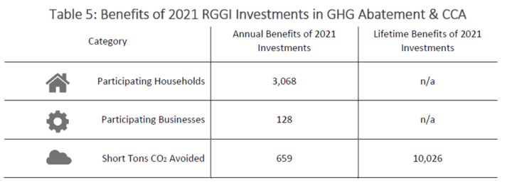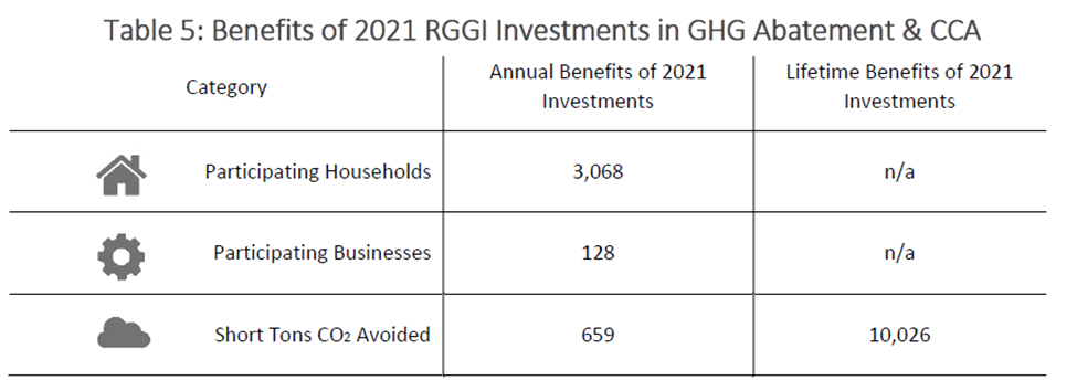 Greenhouse gas (GHG) abatement and climate change adaption (CCA) is a broad category encompassing other ways of reducing greenhouse gases, apart from energy efficiency and clean and renewable energy, as well as projects that focus on preparing for and addressing the impacts of climate change on local communities. Approximately 11% of 2021 RGGI investments supported GHG abatement and CCA programs. Over their lifetime, the investments made in 2021 are expected to avoid the release of over 10,000 short tons of CO2 (see Table 5).