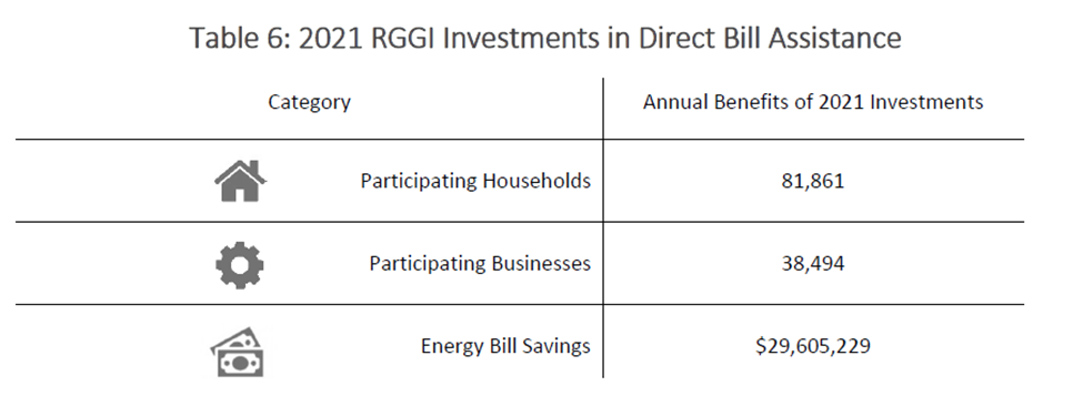 Direct bill assistance returns money to consumers as a rebate on their energy bills. Approximately 13% of 2021 RGGI investments have funded direct bill assistance. RGGI investments in direct bill assistance in 2021 returned $30 million in bill savings to energy consumers in over 81,000 households and 38,000 businesses (see Table 6)