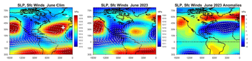 The climatological June SLP and surface wind patterns are shown in the left panel of Fig. 3. Conditions in June 2023, in the center panel, show a remarkably weak subtropical high and an absence of westerly surface winds in the midlatitudes. June 2023 SLP and wind anomalies, shown in the right panel, consist of unusually low pressure and cyclonic circulation over much of the basin, which reflects weakness of the mean anticyclonic flow pattern.