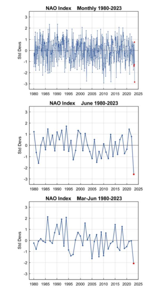 Figure 4 illustrates the magnitude of the June NAO anomaly in context of the historical record since 1980. The very low June 2023 NAO value is not unprecedented in the monthly climatological values; however, it is extremely low relative the previous June values and spring (Mar-Jun) values.