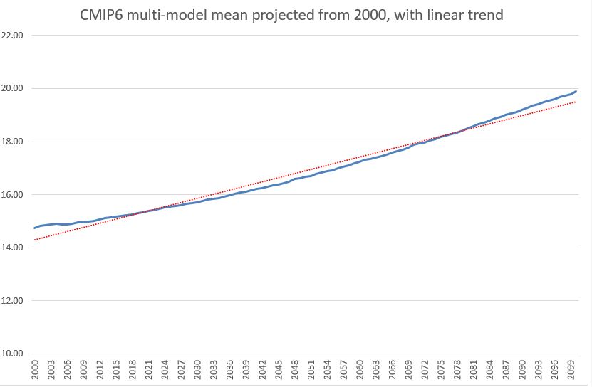 The warming trend in the CMIP6 multi-model mean looks fairly linear to me (‘CMIP6 mean over all members’, ssp585 used).