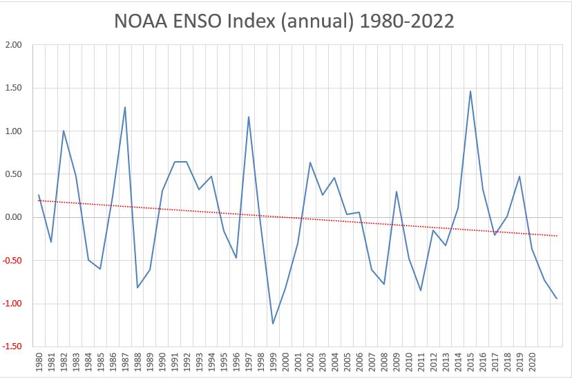 The trend in ENSO since 1980 is slightly negative – ENSO fluctuations do not explain the warming trend since 1980.