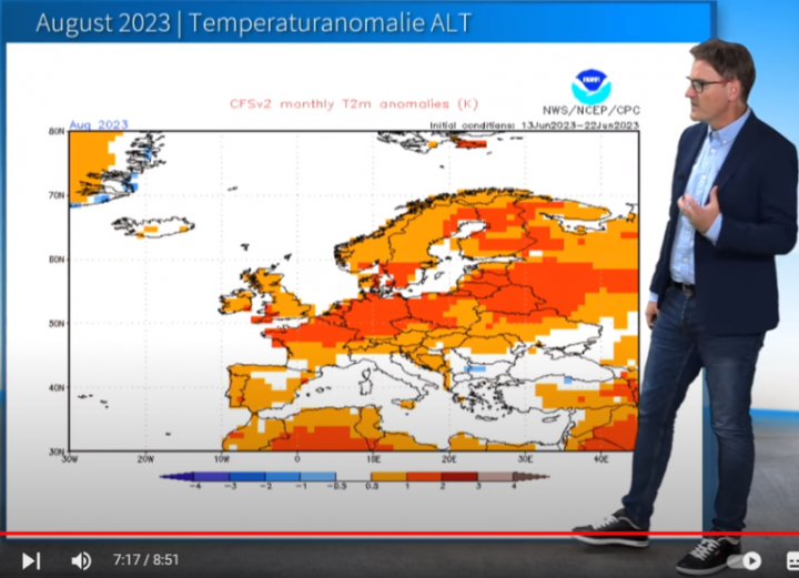 As the presenter explains, the date of 13th-22nd June 2023 is essentially the date of the model run for the prediction of the August temps. You can tell it’s for August as to the top left of the map it has “August 2023” written on it. You can tell it’s an old prediction as it has the words “Temperaturanomalie ALT” written at the top. “Alt” is german for old.