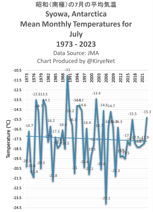 Alarmists have claimed lately that global warming has hit Antarctica, finally. But that hasn’t been the case at all at the Japanese Showa station.