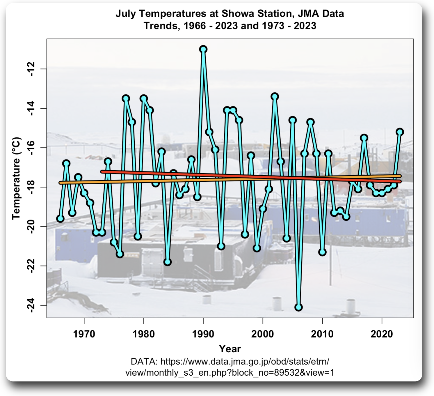 The temperature trend at Syowa, also called Showa, has been modestly downward since 1973: