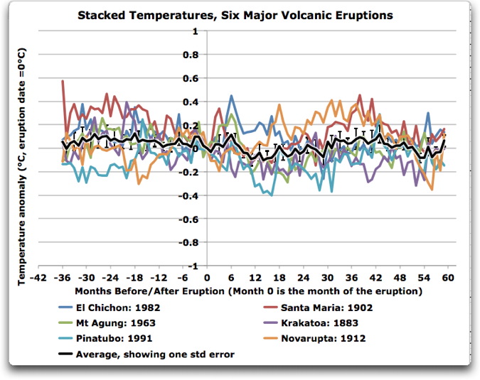 So we should have seen some kind of change within a few months of the eruption … but there’s no sign of that in the data above.