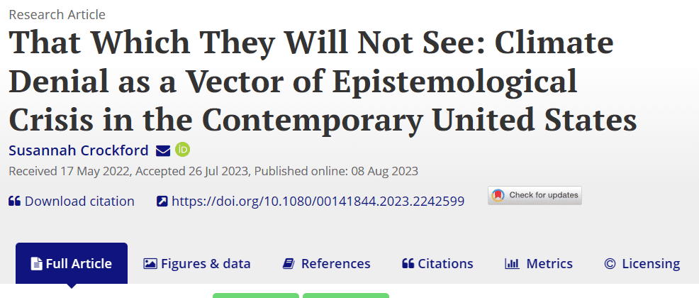 In the vast landscape of climate discourse, few articles stand out as starkly as Susannah Crockford’s piece titled “That Which They Will Not See: Climate Denial as a Vector of Epistemological Crisis in the Contemporary United States”. At first glance, the article promises an in-depth exploration of the cultural epistemology of climate denial in the US, particularly in the southern states. However, a closer examination reveals a piece riddled with constructed narratives that seem more intent on smearing a broad group of people than offering a genuine understanding of their perspectives.