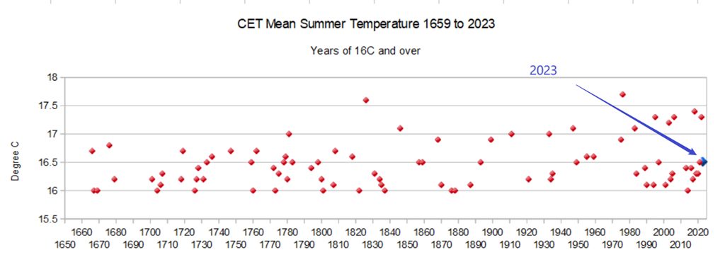 And despite all of that global boiling in June, the summer of 2023 ended up pretty unexceptional, barely above the 30-yr average, no warmer than 1857 and 1859. There have been 38 years with summer temperatures as high or higher.