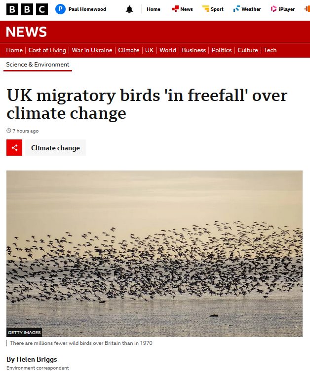 Apart from these two birds, the BBC offer no other evidence to back up their headline, that UK migratory birds are ‘in freefall’ over climate change.