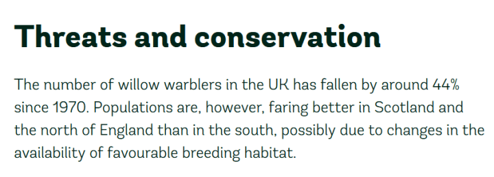 The Woodland Trust make clear that, while willow warbler populations have been dropping in southern England, they have been increasing in the north.