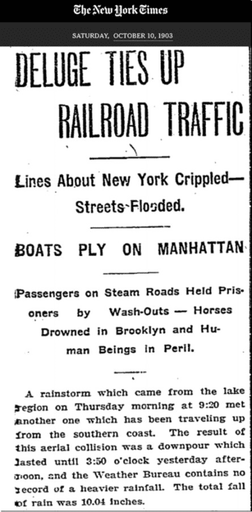 Tony Heller does a great job documenting historical accounts of extreme weather events. He found that on October 8, 1903 New York received 10.04 inches of rain.