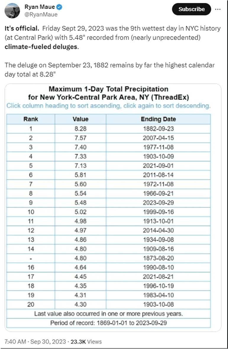 Ryan Maue checked out the Central Park precipitation data and found that on September 23, 1882 the site measured the highest daily value of 8.28” and that this recent event was the 9th wettest day at that site.