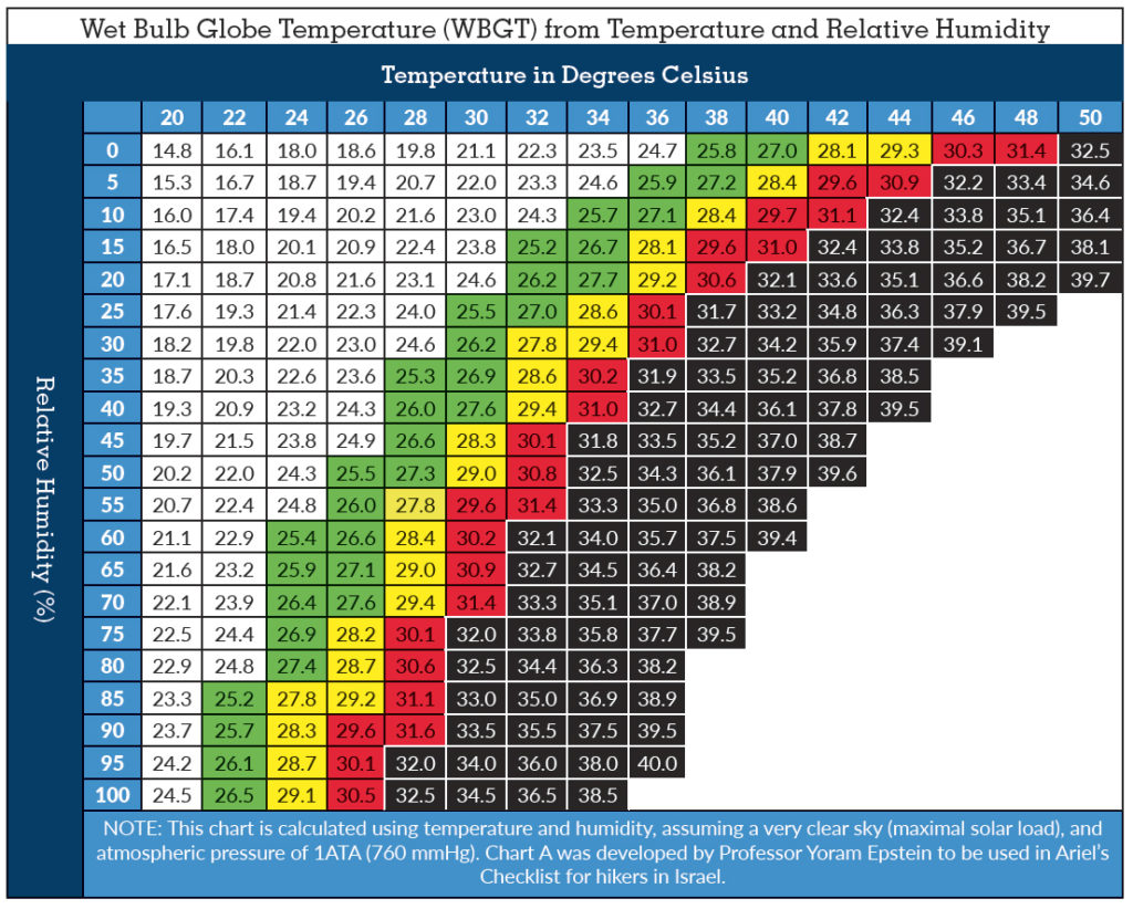 I have personally experienced 46C RH20% during Day 5 of the Murray Marathon a five day endurance race with starts and finish every day. I did not finish and lost a couple of kilos. The table makes sense. They no longer compete on days if the temperature exceeds 40C – we are all getting soft.
