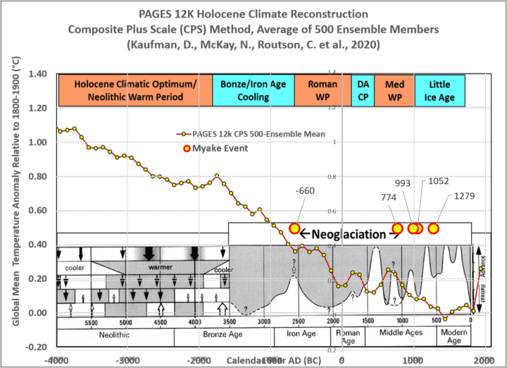 McKay et al., 2020 CPS with historical climate periods and Neoglaciation (Grosjean et al., 2007), with Myake Events.