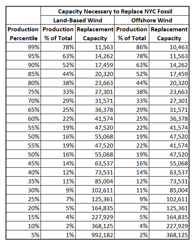 To estimate the wind resources needed to replace New York City’s 9,026 MW of existing fossil-fired generation I will use the distribution of New York land-based wind with the following assumptions. In the absence of offshore observed wind energy historical data, I assumed that the wind production would be increased by a five-percentile category from the onshore wind distributions. In other words, when the onshore wind is at the 75% percentile capacity availability level, I assumed that offshore wind resources are at the 80% capacity level.