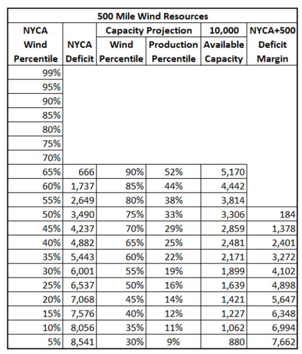 Table 4 provides an estimate of the wind generated capacity available to cover the deficit margin in Table 3 outside the control area in an area similar in size and characteristics to the NYCA 500 miles away from New York City. For this thought experiment I assumed that the wind capacity at any hour in this region would be at a production percentile 25% higher than the corresponding NYCA percentile. I believe that there is higher level of spatial correlation than those who believe that the wind is always blowing somewhere acknowledge. In this example, when NYCA wind levels are at the 65th percentile I presume that 500 miles away the wind resource will be at the 90th percentile. Because I believe that wind in all regions of a similar size to New York will exhibit the same wind distribution pattern, a key takeaway is that wind resources 500 miles away are insufficient to always provide support when power outside the NYCA is needed. The 500-mile resources only cover the NYCA deficit down to 55th NYCA percentile corresponding to the 500-mile 80th percentile. We must go out at least another 500 miles for reliable power.