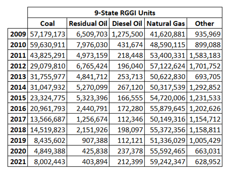The primary cause of the observed RGGI emission reductions has been the fuel switch from coal and residual oil to natural gas. Table 1 lists the emissions by fuel types for the nine RGGI states that have been members since the start. I believe that RGGI had very little to do with these fuel switches because fuel costs are the biggest driver for operational costs and natural gas was cheaper. The cost adder of the RGGI carbon price to date has been too small to drive the conversions from coal and oil to natural gas.