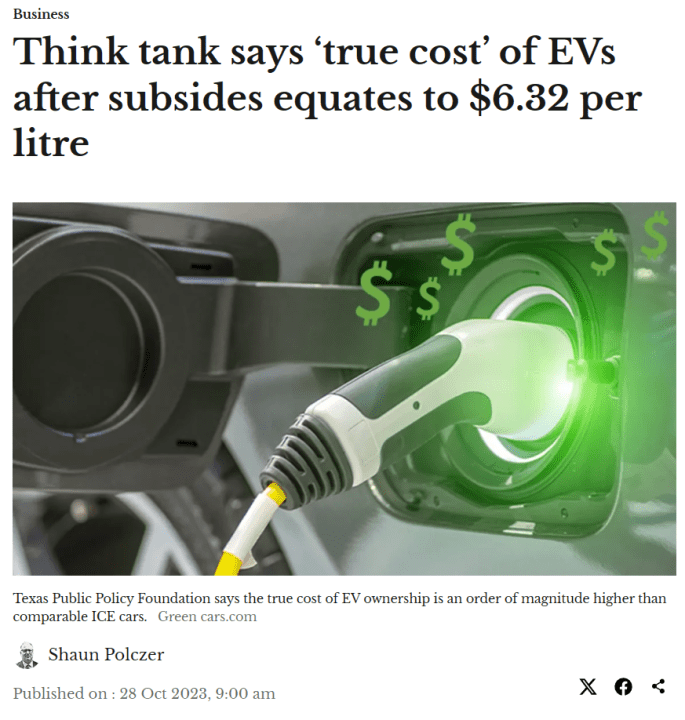 “Despite a common perception that electric vehicles are cheaper to own and operate than their internal combustion counterparts, a Texas think tank says the true cost is the equivalent of USD$17.33 per gallon — or CAD$6.32 per litre — over the life of the car, after factoring in subsidies and incentives.”