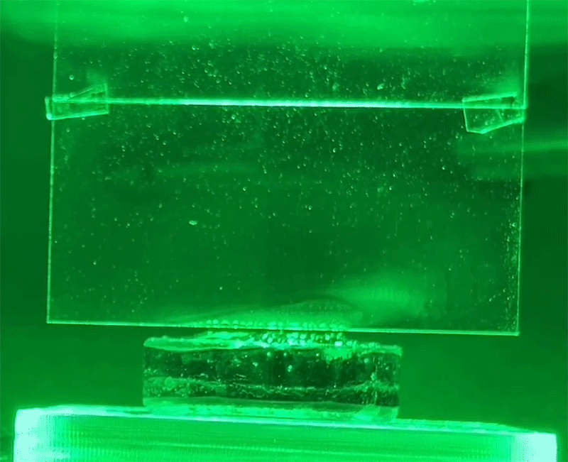 White condensation on glass as green light evaporates a water-laden hydrogel. (Tu et al., PNAS, 2023)