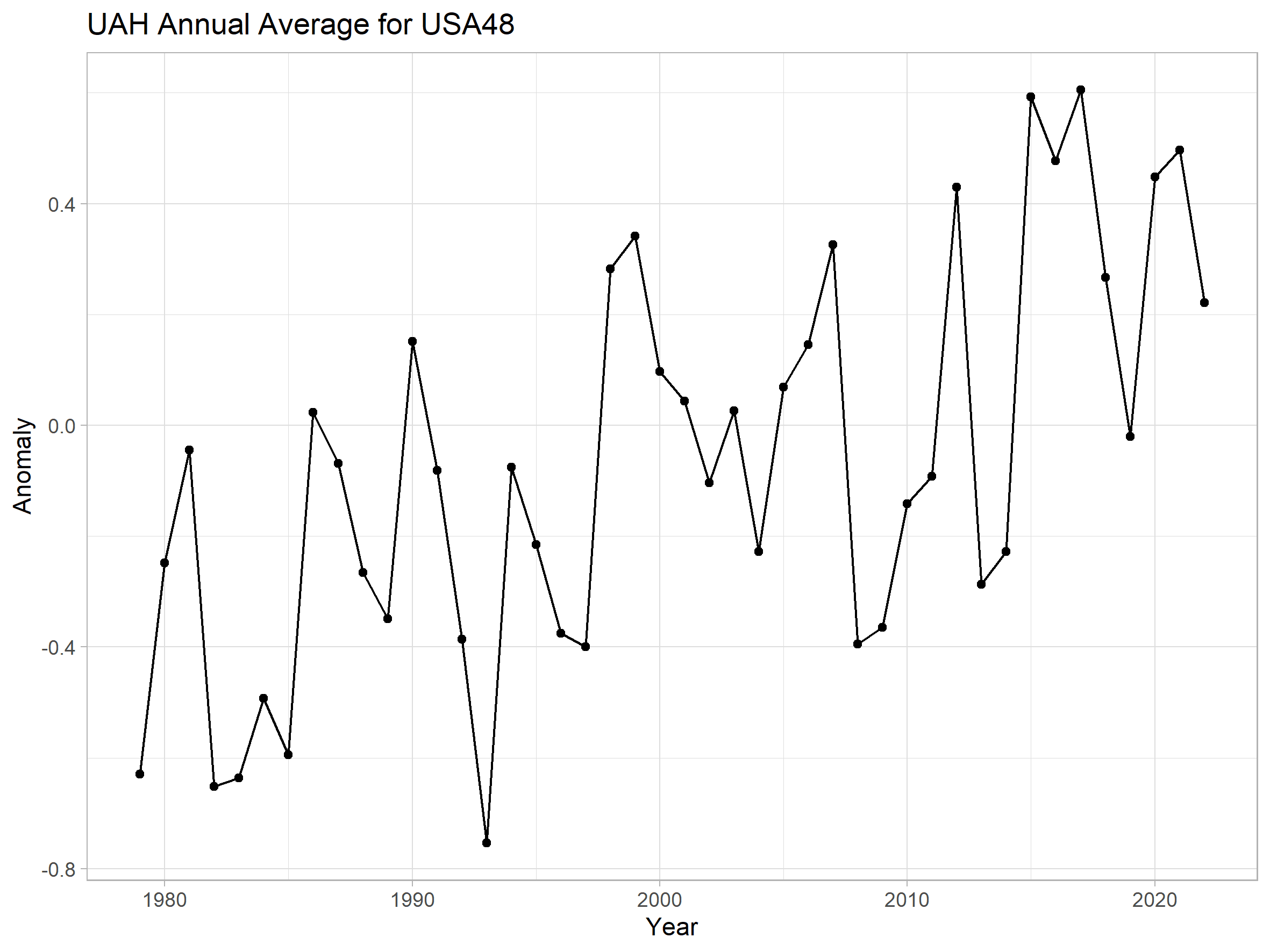 OK, since 2005, when USA temperatures were measured in a reasonable way and at reasonable surface sites, the average trend of satellite (UAH-USA48), and surface (ClimDiv and USCRN), is about 0.02ºC per year.