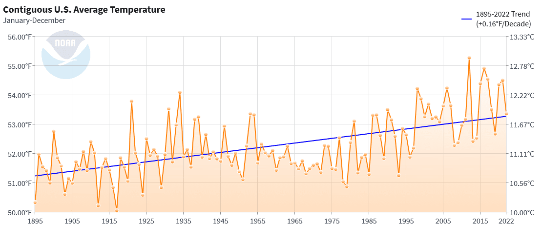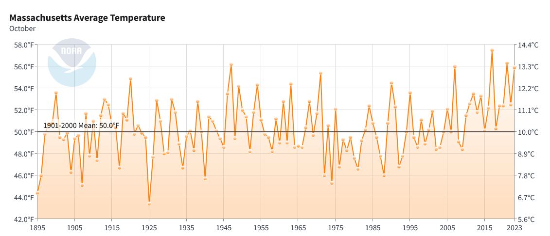 I’m still having trouble with the following NOAA chart for Wokeachusetts. How can it range from 46F one year to 56F another year? This is what the state is using to push all the alarm bells. Could the annual average temperature really change that much? Up 12F???