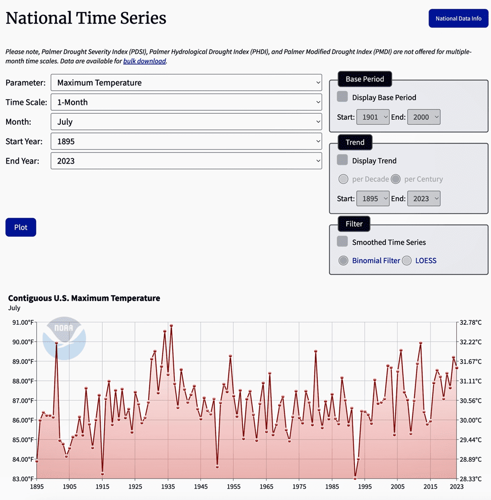 The NOAA data establishes that the highest maximum temperatures in the Contiguous U.S. occur in the month of July with all July monthly maximum temperature measured data show below for the period from 1895 to 2023.