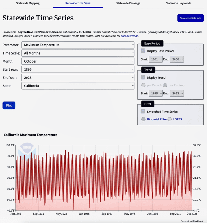 Looking at NOAA California monthly maximum temperature data (shown below) from 1895 to 2023 in pursuit of “warming“ growth rates “60% greater” than the world as a whole we find no measured scientific evidence supporting these contrived climate alarmist hyped claims.