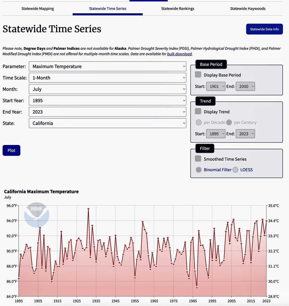 California’s maximum monthly temperature recorded data shows that July 1931 (by 1.4 degrees F higher than the next highest maximum) was the highest ever measured temperature as shown below from NOAA’s measured data.