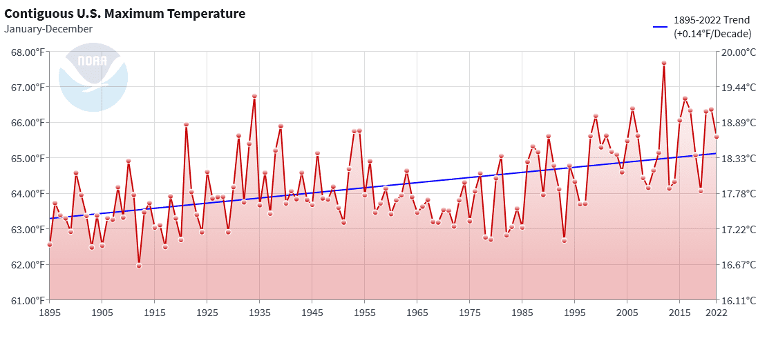 NOAA Contiguous U.S. maximum temperatures (without cheery picking months) for 1970 to 2023.