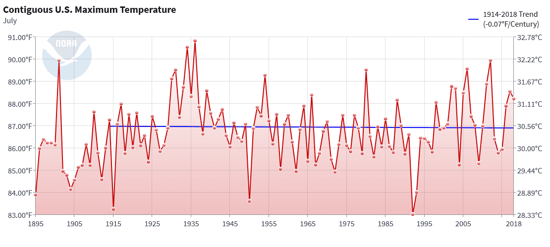 Since 1970, NOAA shows US maximum temperatures, just for July, as warming at 0.2°C / decade.